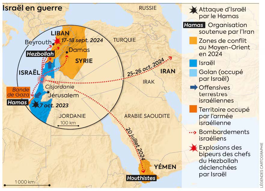 Israël plus puissant que jamais, au centre la recomposition du Proche- Orient. Belle revanche pour un pays victime d’un massacre de civils inédit dans son histoire, attaqué sur plusieurs fronts, conspué sur les campus occidentaux, critiqué par la plupart des chancelleries. Fragilisé comme jamais il y a quatorze mois, l’Etat hébreu a rétabli sa capacité de dissuasion et inversé le rapport de force avec ses ennemis. Retour sur une année qui a changé le visage du Moyen-Orient.