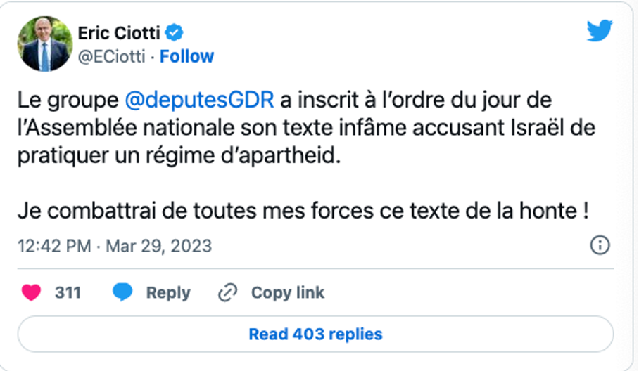 Le groupe NUPES-Communistes a inscrit à l’ordre du jour de l’Assemblée nationale du 4 mai prochain une proposition de résolution assimilant Israël à un régime « d’apartheid ». Le texte a été rédigé par le député communiste Jean-Paul Lecoq et avait été enregistré à la présidence de l’Assemblée nationale le 13 juillet dernier.