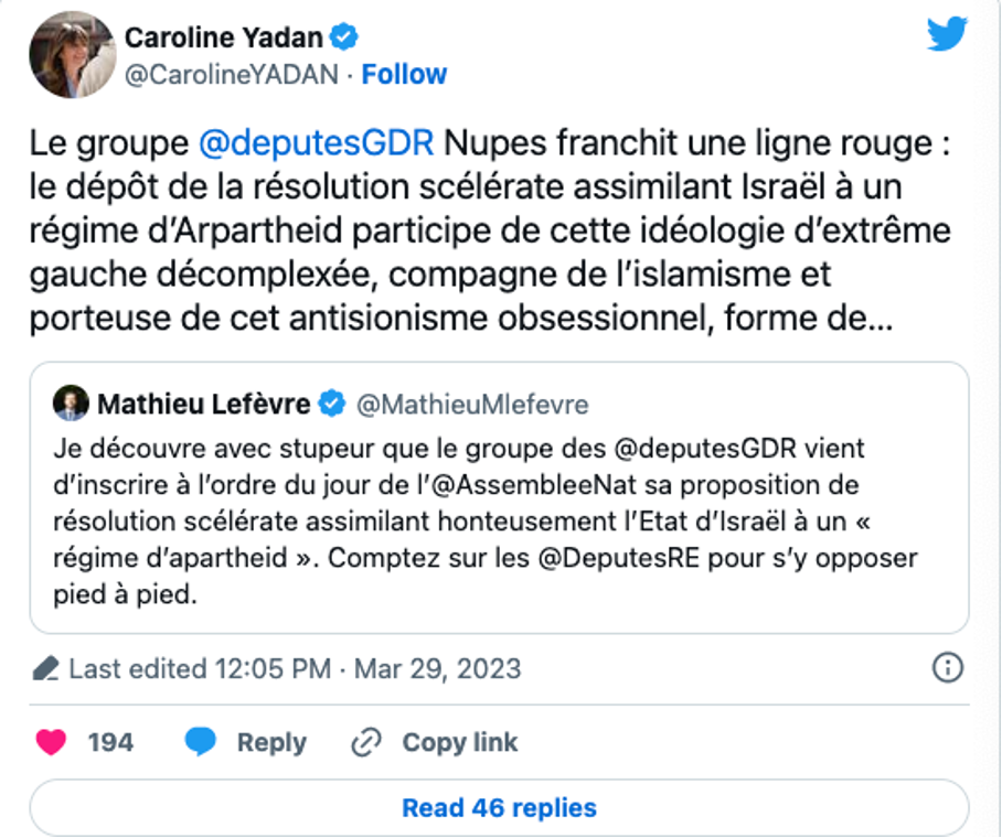 - Caroline Yadan, députée Renaissance de Paris a interrogé Yann Hwang sur les mesures envisagées par la France pour désamorcer l’escalade nucléaire en Iran. https://twitter.com/CarolineYADAN/status/1641058455854149632?s=20