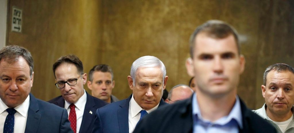 Israeli Prime Minister Benjamin Netanyahu (C) arrives to the weekly cabinet meeting at his office in Jerusalem on July 15, 2018. / AFP PHOTO / POOL / RONEN ZVULUN