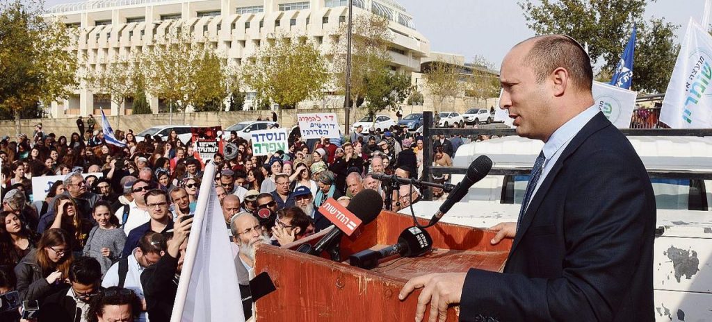 La moitié du gouvernement israélien est descendu dimanche dans la rue pour manifester contre le gouvernement. Neuf ministres sur dix-huit ont participé à un rassemblement de l’extrême droite religieuse sous les fenêtres du domicile du premier ministre Benyamin Nétanyahou, pour protester contre leur propre politique sécuritaire en Cisjordanie, qu’ils jugent trop laxiste. Deux participants, le ministre de l’Éducation Naftali Bennet et la ministre de la Justice Ayelet Shaked, membres du parti Foyer juif, présentent la particularité d’appartenir au cabinet de sécurité d’Israël qui met en œuvre la politique de défense.